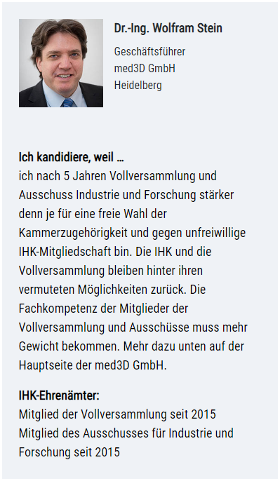 ich für eine innovative, leistungsstarke, moderne, am Markt orientierte IHK bin. Ich sehe große Chancen, die IHK hat beste Neu-Startbedingungen! Dabei steht sich die IHK durch die bisherige Marktverzerrung, verursacht durch die ZWANGSMITGLIEDSCHAFT, selbst am meisten im Weg. Bis zu deren Abschaffung bin ich für eine Reduzierung der Zwangsbeiträge und eine Refokussierung der IHK auf ihre Kernaufgaben. Mehr dazu unter: www.med3D.de/IHK